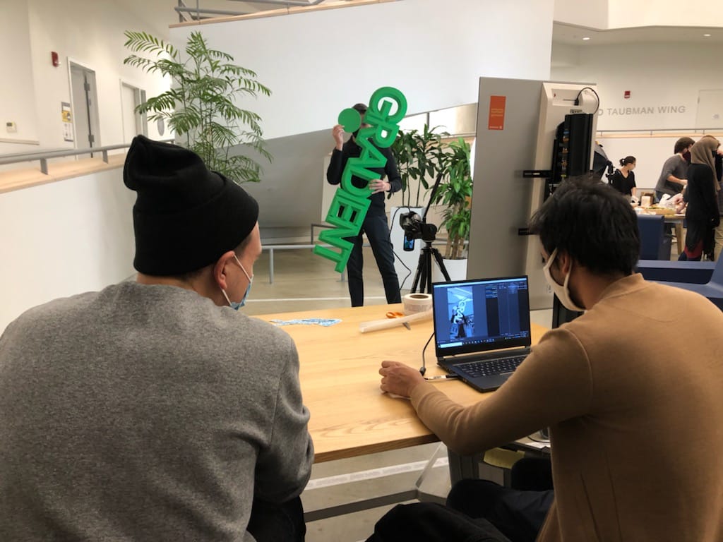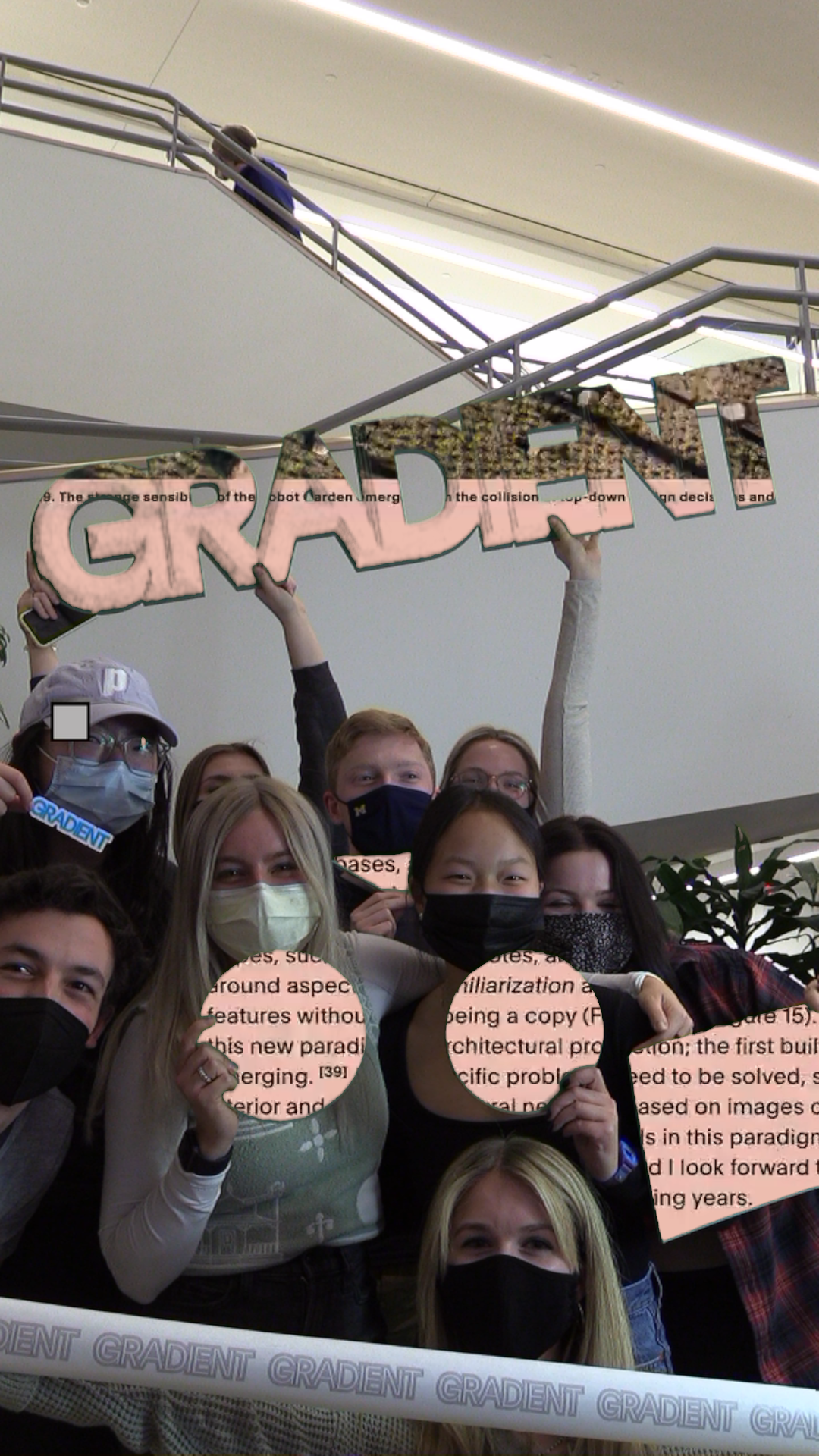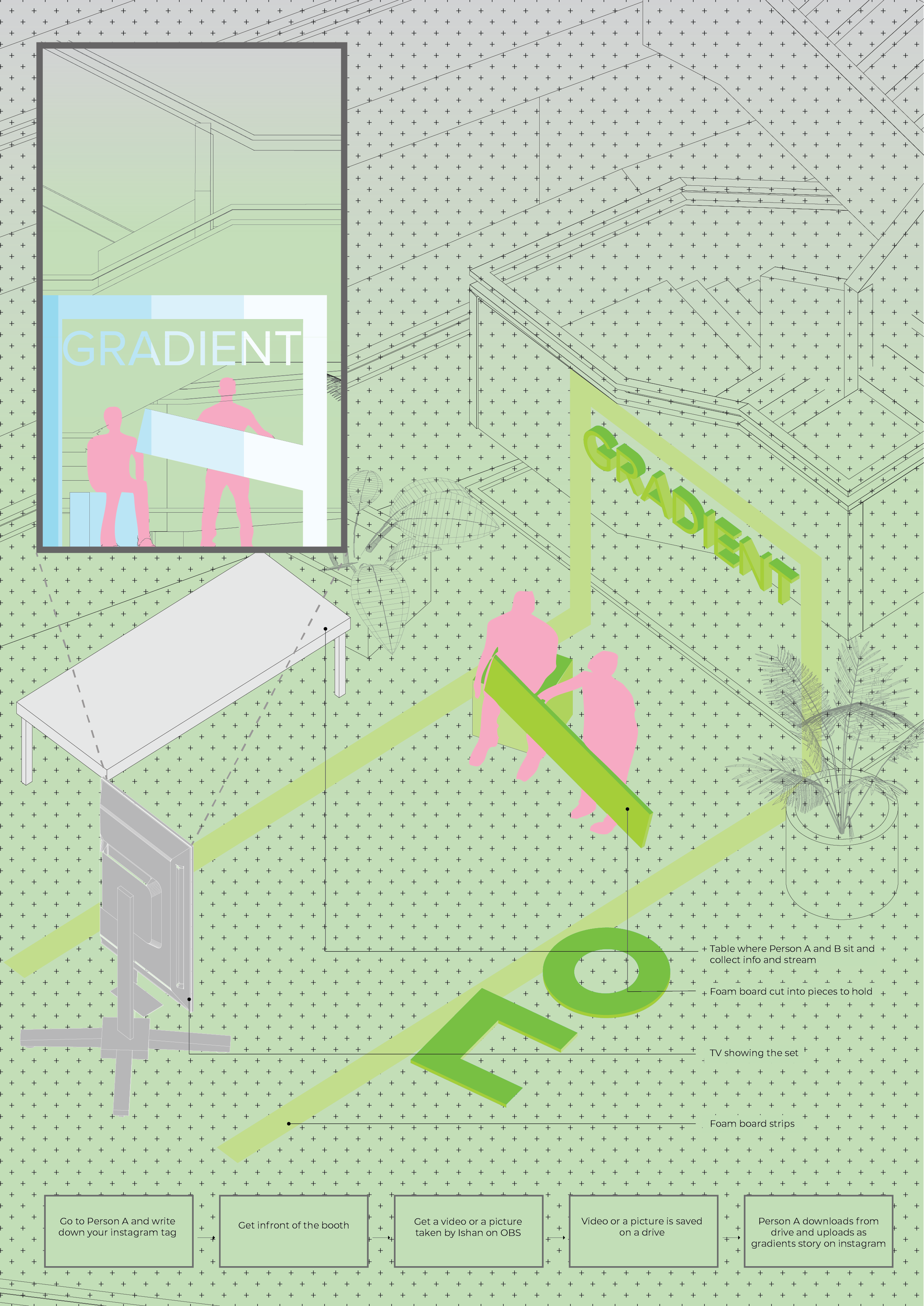 Participants stepping in front of the screen could see themselves integrated into the dynamic backdrop of the Gradient journal's graphics. The magic unfolded when they interacted with specially designed greenscreen objects. Moving these objects in front of the screen allowed the journal's graphics to be visible through them, creating a mesmerizing and playful visual effect. This interactive element transformed the participants into living components of the journal, symbolizing its collaborative and inclusive spirit.